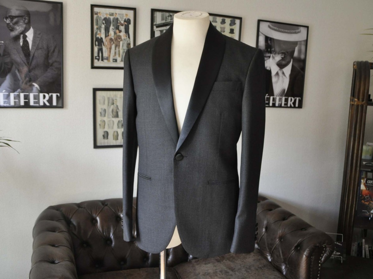 お客様のタキシードの紹介- グレーバーズアイショールカラータキシード- お客様のタキシードが仕上がってまいりましたのでご紹介いたします。 生地はBiellesi グレーバーズアイ ショールカラーのタキシードにてご注文いただきました。 Cloth:Biellesi グレーバーズアイ 裏地:ワインレッドヘリンボ...